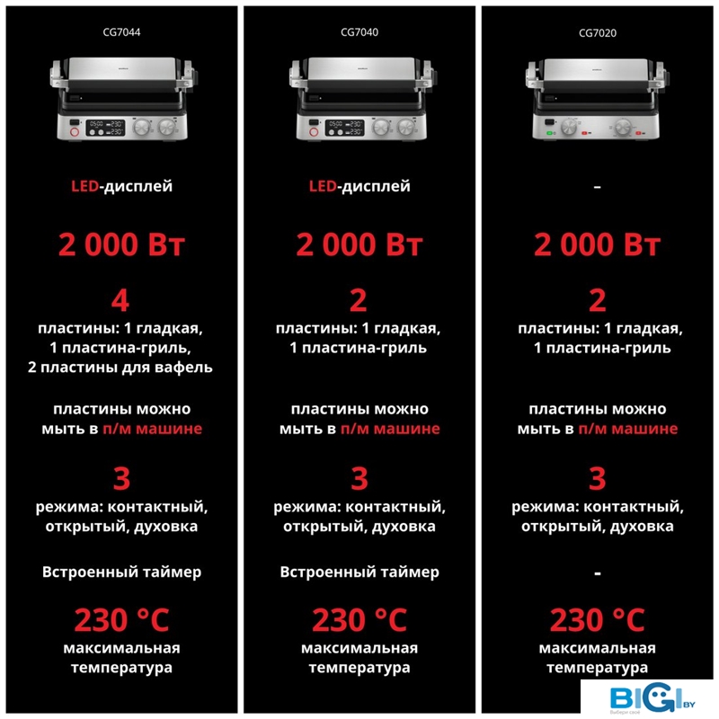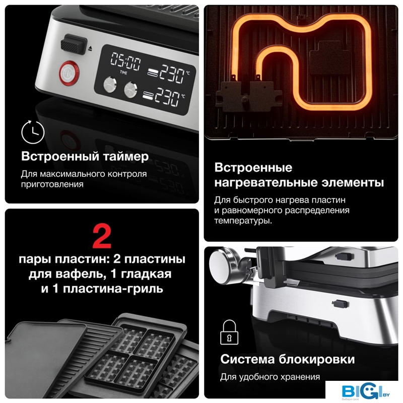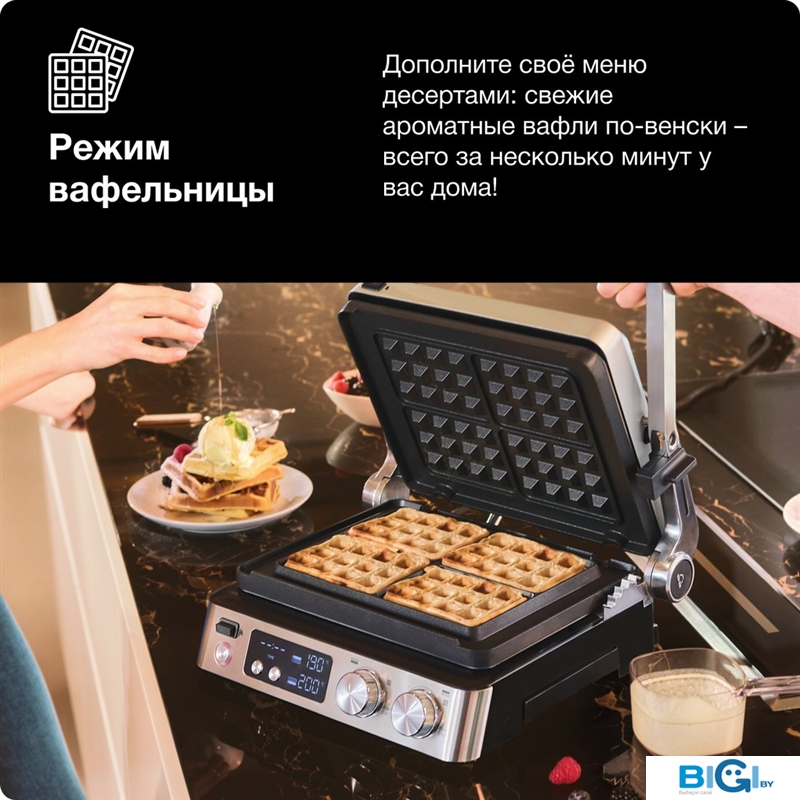 - Рабочая поверхность: вафельница, гладкая плита, рифленая плита