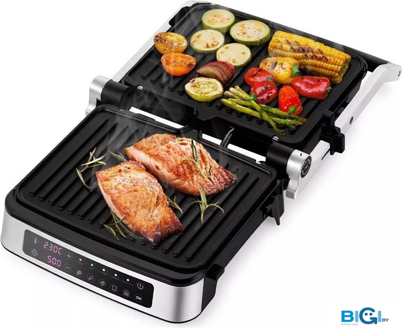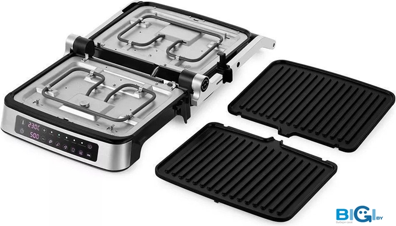 - Комплектация: Электрогриль со съемными нагревательными пластинами: гладкая и ребристая