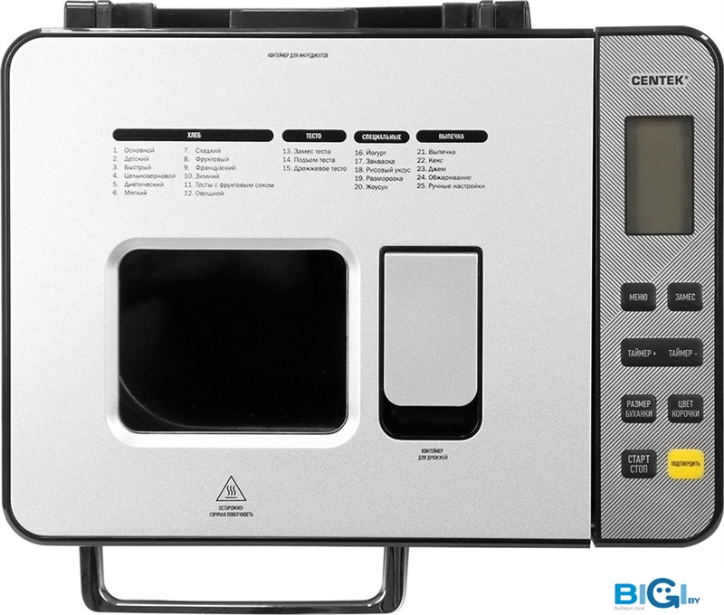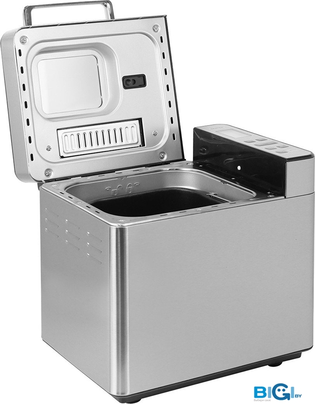 - Перечень режимов работы: Основной, Французский, Цельнозерновой, Быстрый, Сладкий, Без глютена, Супербыстрый, Тесто, Джем, Кекс, Сэндвич, Выпечка.