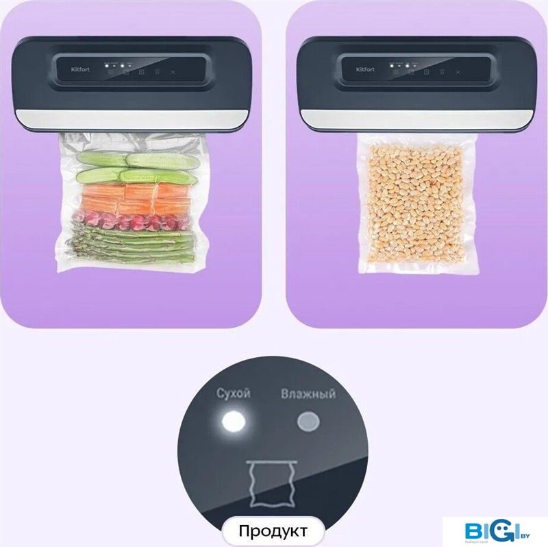 - Режимы: сухие продукты, влажные продукты, щадящий (soft vacuum), запаивание без вакуума, мгновенная остановка