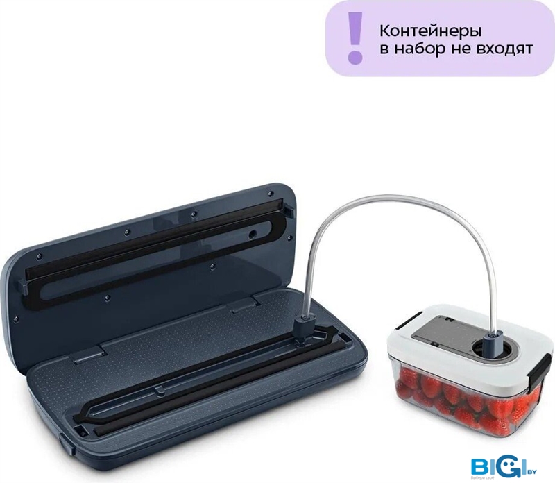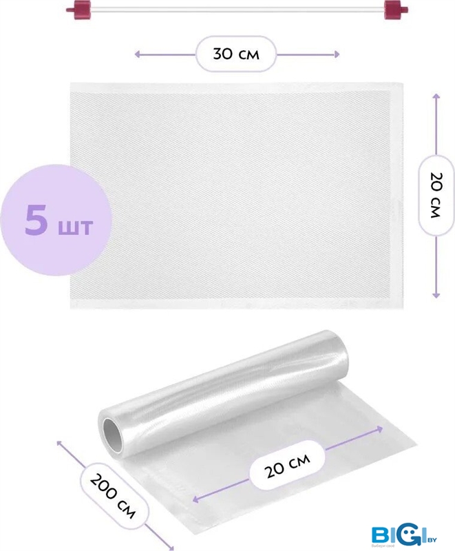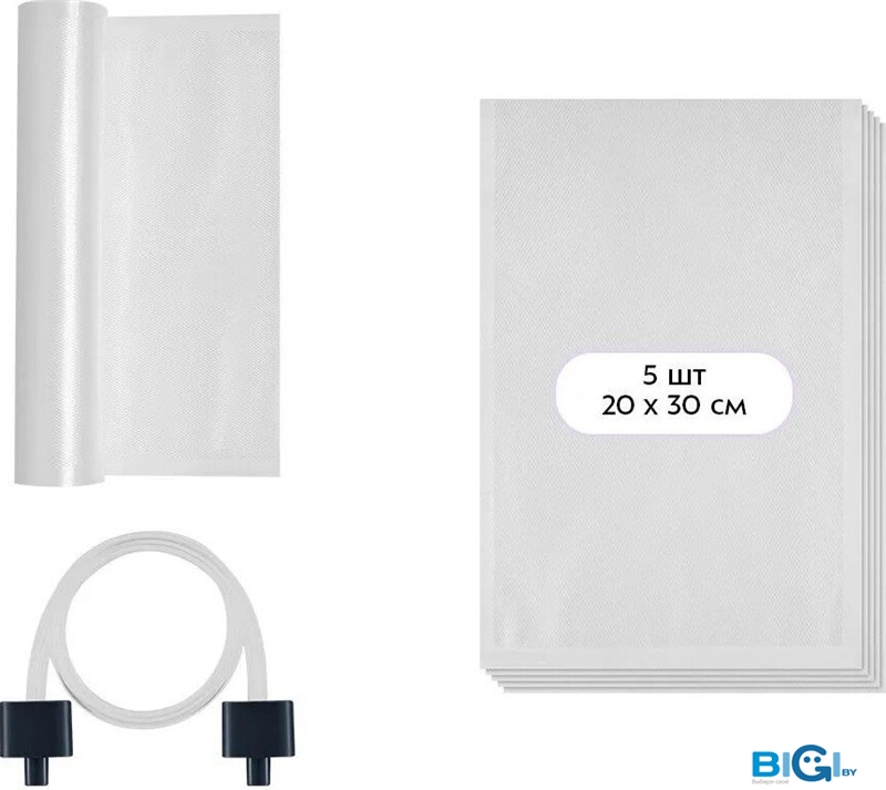 - Комплектация: 5 пакетов для вакуумирования 20 х 30 см, рулон плёнки для самостоятельного изготовления пакетов, шланг для вакуумирования в контейнерах