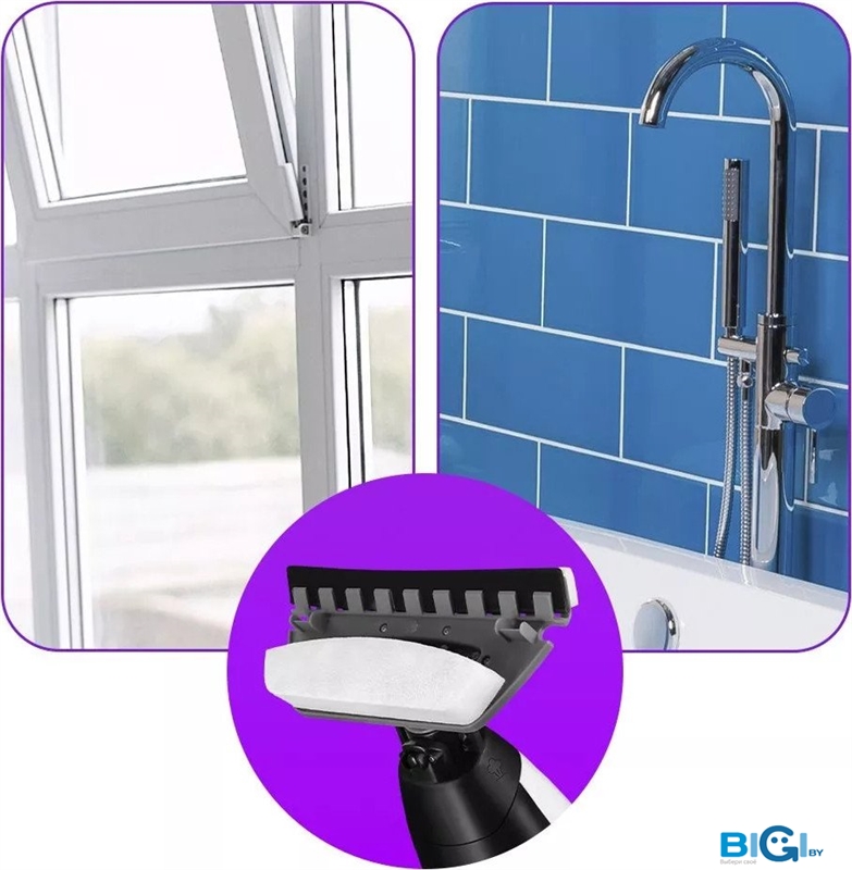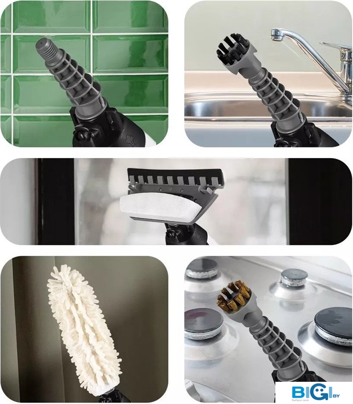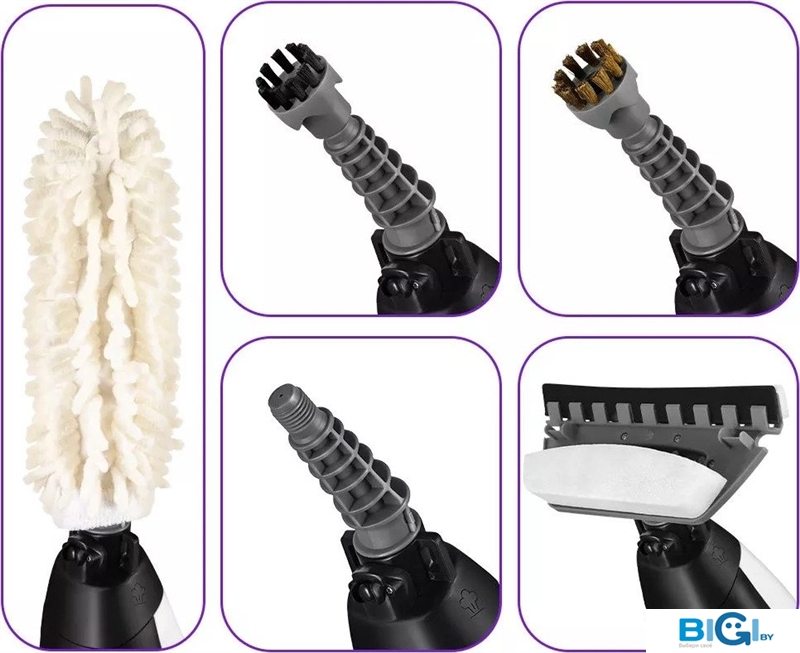 - Комплектация: круглая щетка (большая, малая), скребок, плоская щетка, тряпка для пола, рамка для ковра, струйная насадка, угловая насадка, тряпка для отпаривания