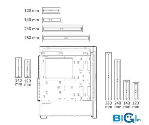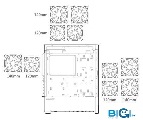 - Конфигурация вентиляторов: спереди: 3 x 120 ммсверху: 2 x 120 ммснизу: 2 x 120 ммсзади: 1 x 120 мм