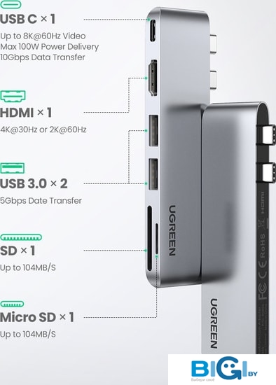 - Разъемы на устройстве: USB Type-A 3.2 Gen1 (5 Гбит/с), USB Type-C, HDMI