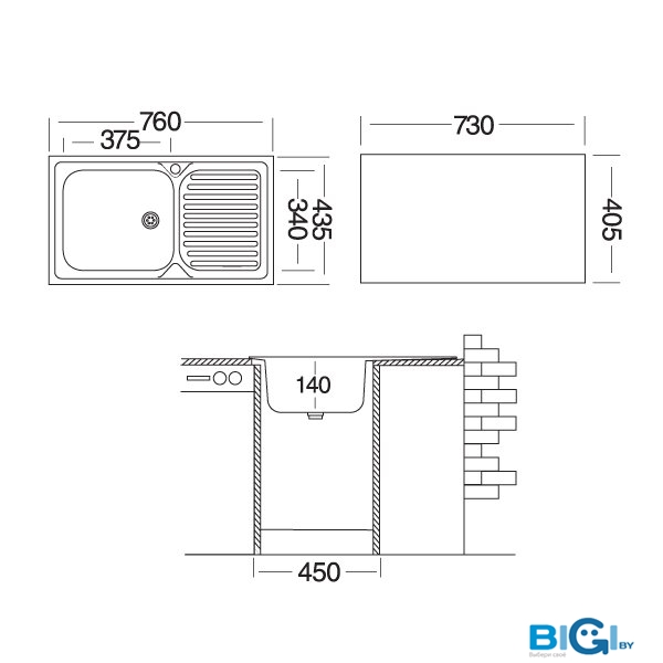 - Ширина мойки: 76 см