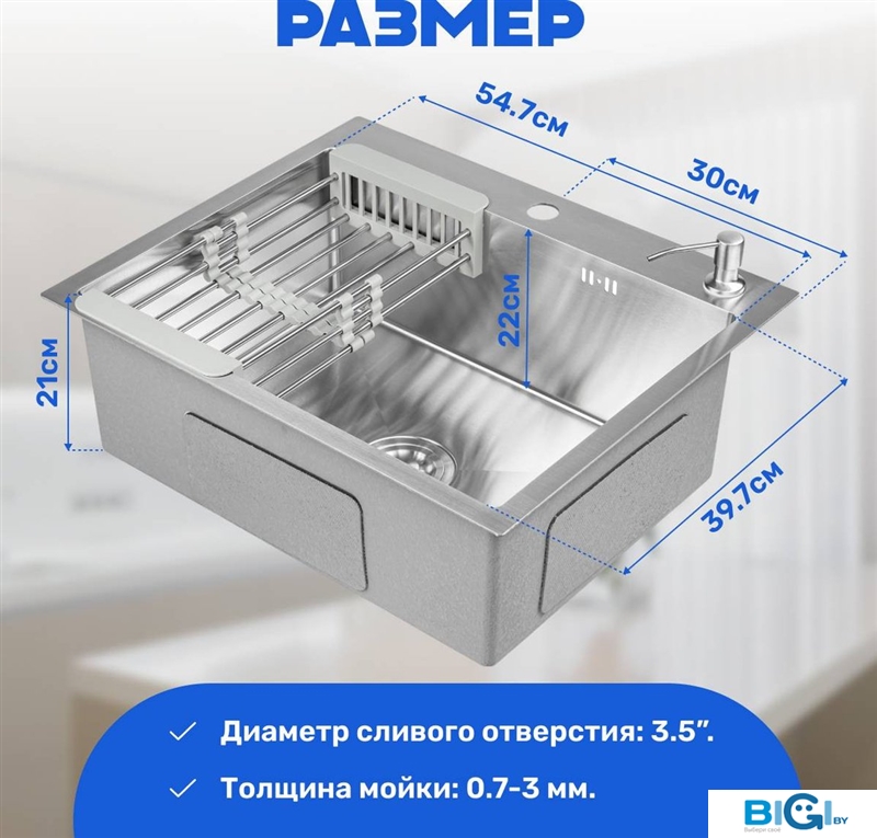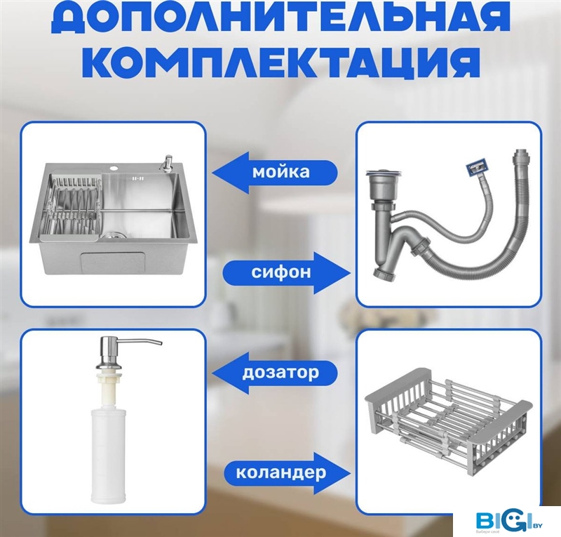 - Комплектация: сифон, коландер, дозатор для моющего средства, мойка