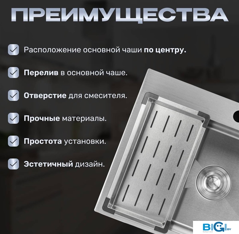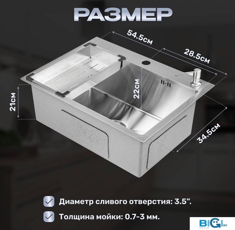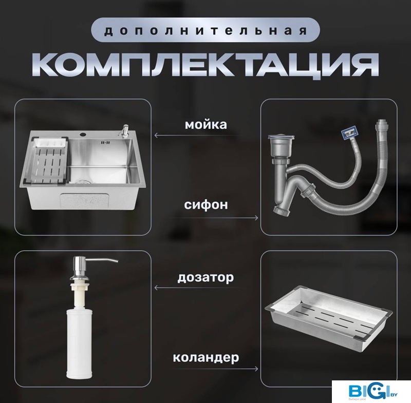 - Комплектация: сифон, коландер, дозатор для моющего средства, мойка