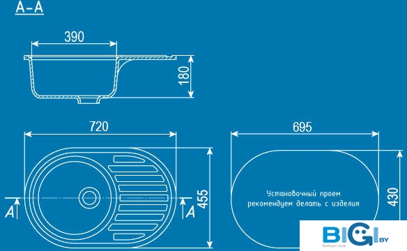 - Глубина мойки: 43.5 см