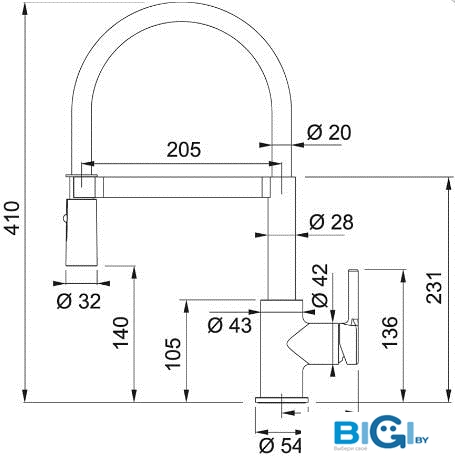 - Длина (вылет) излива: 205 мм