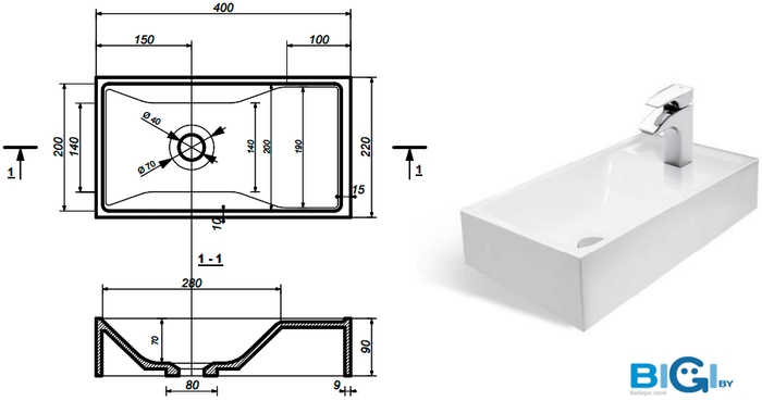 - Отверстие под смеситель: 1