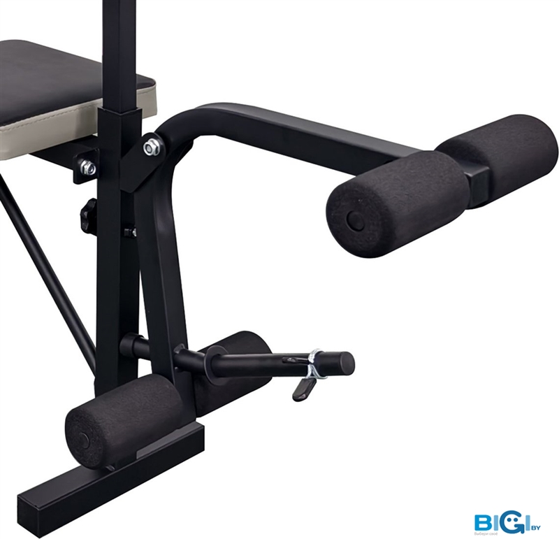 - Конструкция: стойка для штанги, скамья для жима штанги, парта Скотта, блок для ног