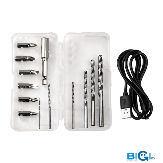 - Комплектация: - Дрель-шуруповерт аккумуляторная 1 шт. - Руководство по эксплуатации 1 шт. - Кабель зарядки USB 1 шт.- Сверло 6 шт.- Бита 6 шт.- Переходник для бит 1 шт.- Кейс