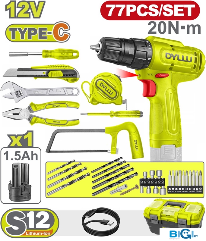 Дрель-шуруповерт Dyllu DTDT4B77 (с 1-им АКБ, кейс, набор инструментов)