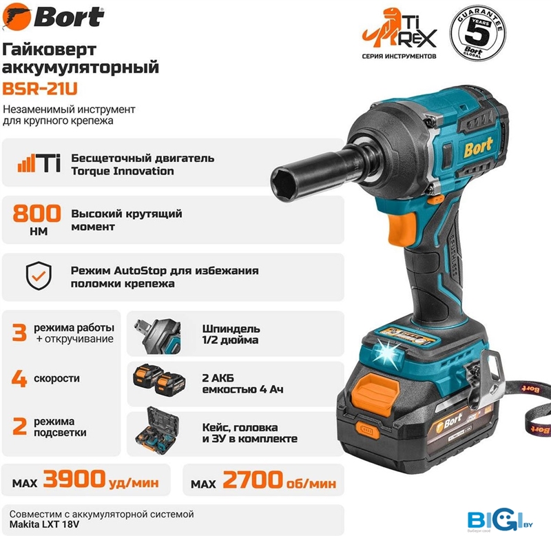 Гайковерт Bort BSR-21U 93418477 (с 2-мя АКБ, кейс), код 1356156