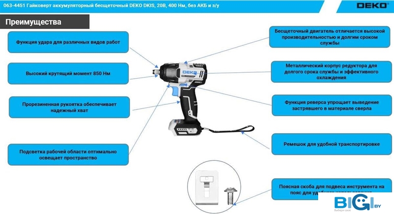 - Комплектация: - Гайковерт аккумуляторный – 1 шт- Аккумулятор – 2 шт- Зарядное устройство – 1 шт- Сменная головка 22 мм– 1 шт- Руководство по эксплуатации – 1 шт- Кейс – 1 шт