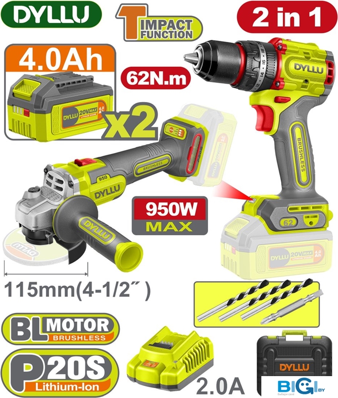 Dyllu DTCK20273 (шуруповерт, болгарка, 2 АКБ, кейс)