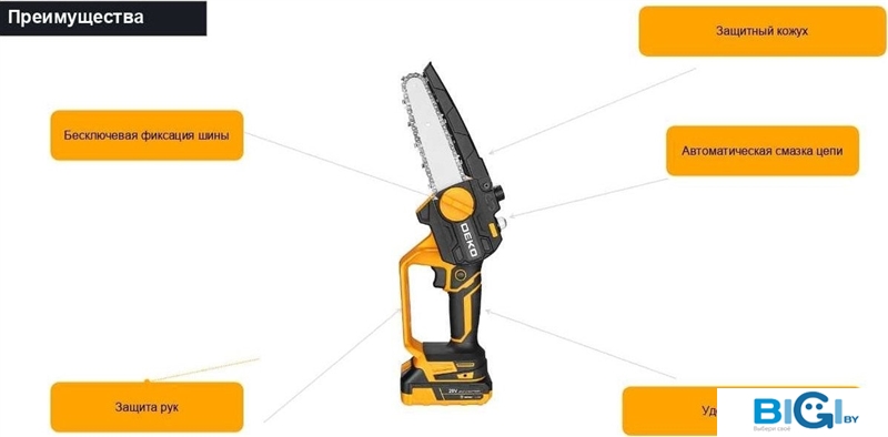 - Комплект поставки: - Цепная пила- Шина- Пильная цепь- Масло для цепи- Аккумулятор 2,5 Ач- з/у