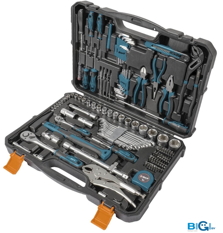 - Комплектация: Головки 1/2" (11 шт) Головки 1/4" (8 шт) Головка торцевая свечная, 1/2" (2 шт) Шарнир карданный 1/2 (1 шт) Удлинитель 1/2":125 мм (1 шт) Рукоятка с трещеткой квадрат 1/2 (1 шт) Ключ комбинированный (7 шт) Ключ шестигранный (9 шт) Плоскогубцы 160мм (1 шт) Ключ разводной (1 шт) Отвертка (5 шт) Молоток (1 шт) Переходник для торцевых головок (1 шт) Биты 1/4 (33 шт) Отвертка для бит (1 шт)