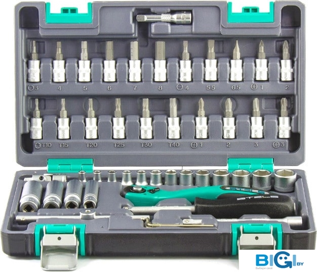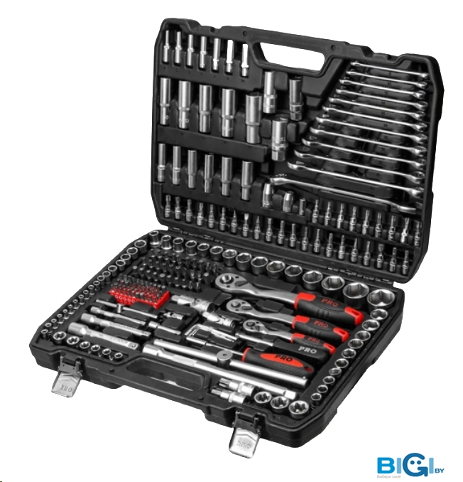 - Комплектация: - Ключ трещоточный 1/2.- Ключ трещоточный 1/4.- Головки торцевые 1/2: 10, 11, 12, 13, 14, 15, 17, 19, 22, 24, 27, 30, 32.- Головки торцевые 1/4: 4, 5, 6, 7, 8, 9, 10, 11, 12, 13.- Головки торцевые 1/4, удлиненные: 5, 6, 7, 8, 9.- Ключи комбинированные: 10, 11, 12, 13, 14, 15, 17, 19.- Кардан 1/2.- Кардан 1/4.- Удлинитель 1/2.- Удлинитель 1/4.- Отвертка-держатель 1/4.- Переходник для бит 1/4.- Набор шестигранных ключей: 1.5 мм, 2.0 мм, 3 мм, 3.5 мм, 5 мм, 6 мм, 7 мм.- Головки свечные 16 мм и 21 мм.- Вороток Т-образный 1/2.- Биты: Т10, Т15, Т20, Т25, Т27, Т30, T40, SL3, SL4, SL5, SL6, PH1, PH2, PH3.- Пассатижи.- Клещи переставные.- Молоток, масса головки 0,3 кг.- Отвертки: SL6 x 100; SL6,5 x 38, PH2 x 38; PH2 x 100; PH3 x 200.