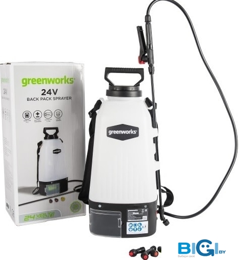 - Комплектация: Аккумуляторный садовый опрыскиватель Greenworks 24VРуководство по эксплуатации4 насадки-форсункиГарантийный талон
