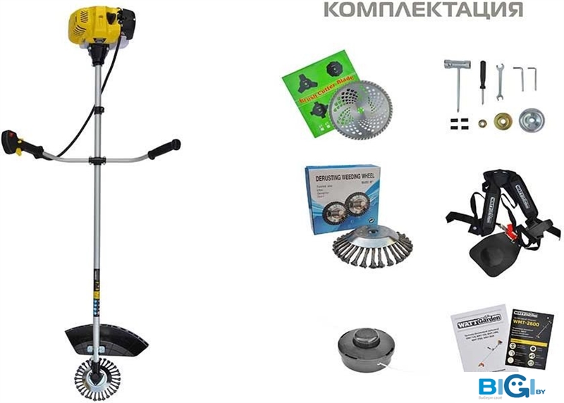 - Комплектация: - Бензиновый триммер- Катушка с леской (аналог Stihl)- 40-зубчатый отрезной нож- Проволочная насадка- Канистра для смешивания топлива- Комплект ключей для сборки- Ранцевый ремень